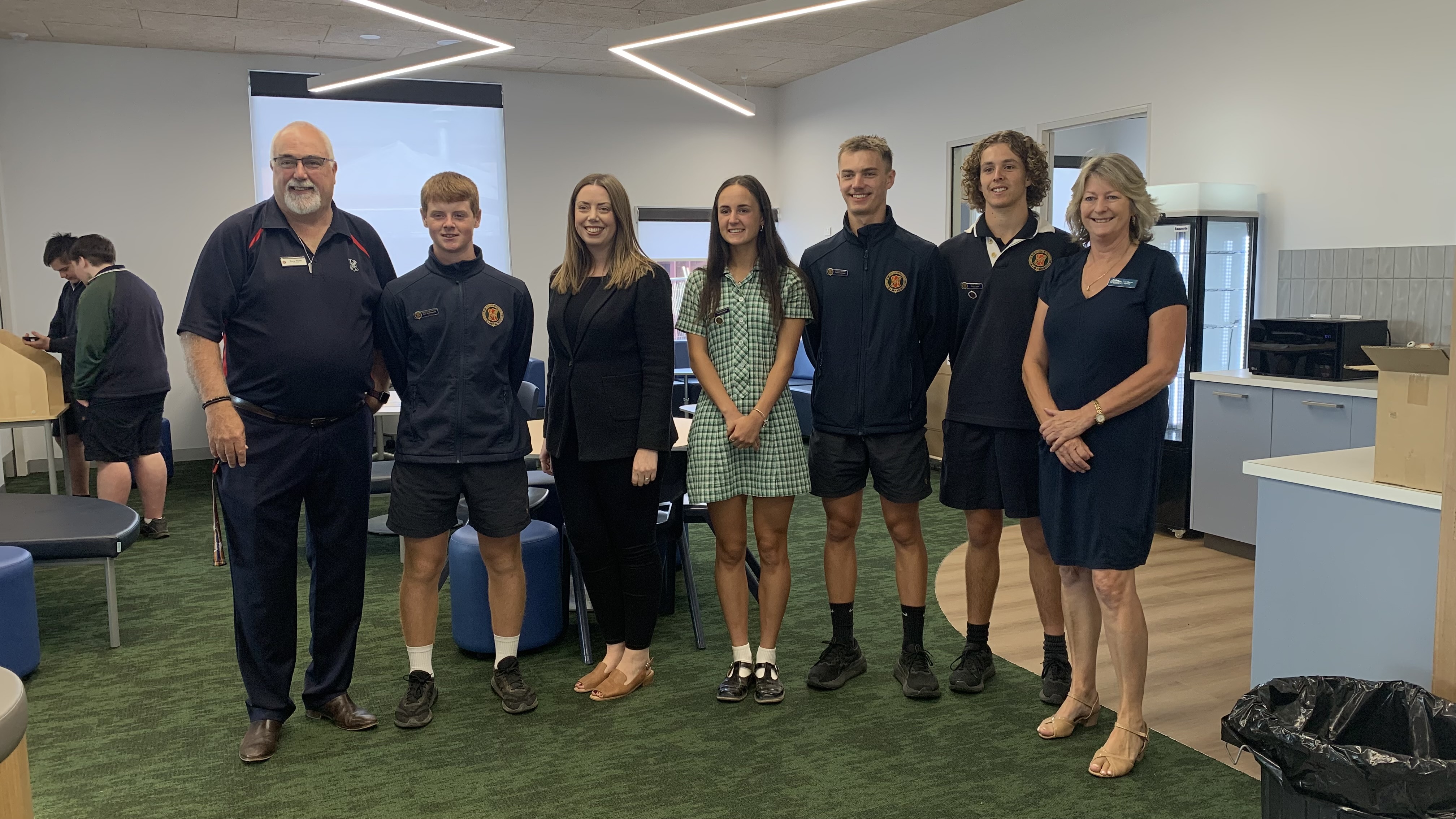 Principal of St. Arnaud Secondary College, Tony Hand welcomed Martha Haylett, Member for Ripon, Cr. Karen Hyslop NGSC, Mrs Therese Allen SEIL DET, Bill Anderson School Council President, Melissa Mitchell Principal, St Arnuad Primary School, Terry Jones Site Manager, Dean Stevens CEO Nicholson Construction College Captains Tyson Funston, Owen Lowe, Ben Greenaway and Scarlett Hand and took them on a tour of the djimbtarrang Wing - D Block.