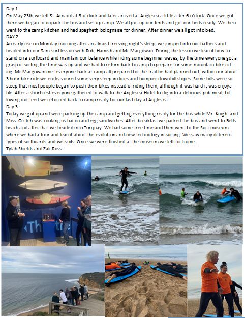 On Sunday, Monday and Tuesday, our Year 11 and 12 Outdoor Education students travelled and camped in Anglesea. This camp is designed to allow the students to see and put their theory into action, and the students were able to participate in some mountain bike riding and surfing. Thanks to Mr. Knight and Miss. Griffith, who took the students on the camp, and to former teacher, Mr. Colin Macgowan, who was able to provide his local knowledge and experience to the students.