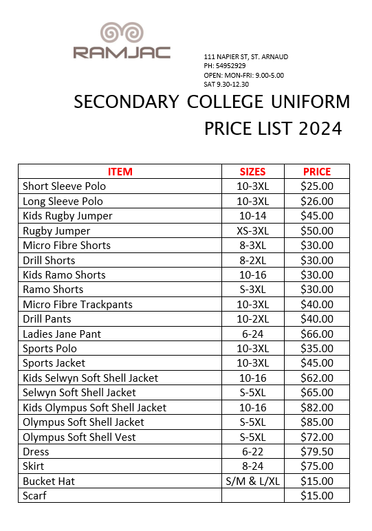 2024 Secondary College Uniform Price List